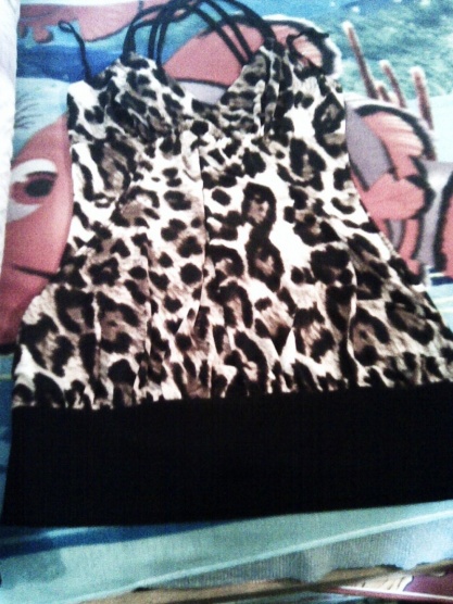 S moderním zvířecím motivem, na zádech překřížená ramínka, splývavý střih, optická délka cca 72 cm. 95% polyester, 5% elastan.