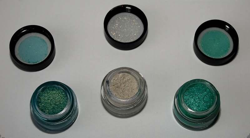 Aqua Gold (taková modrozelená s odlesky do zlatova), Gold Irridescent (vypadá to jako bílé prosvětlovací stíny, ale také hází odlesky do zlatova), a poslední Mint Green (já jsem prostě na tu zelenou