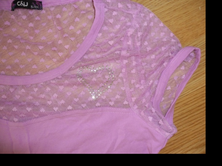 0Moc hezké tričko s krajkou a kamínkovou aplikací ve tvaru srdce. Nikdy nenošené. Vel uvedena XL, ale já doporučuji S až M. Elastický materiál.