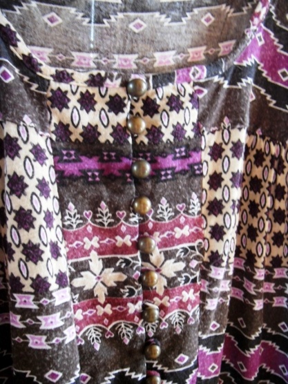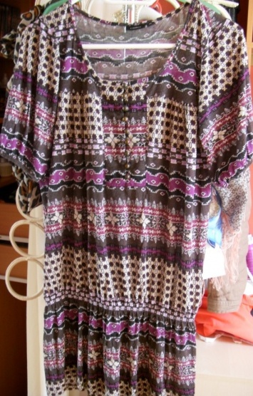 - ve výstřihu na knoflíky, na bocích má nařasenou splývavou sukni