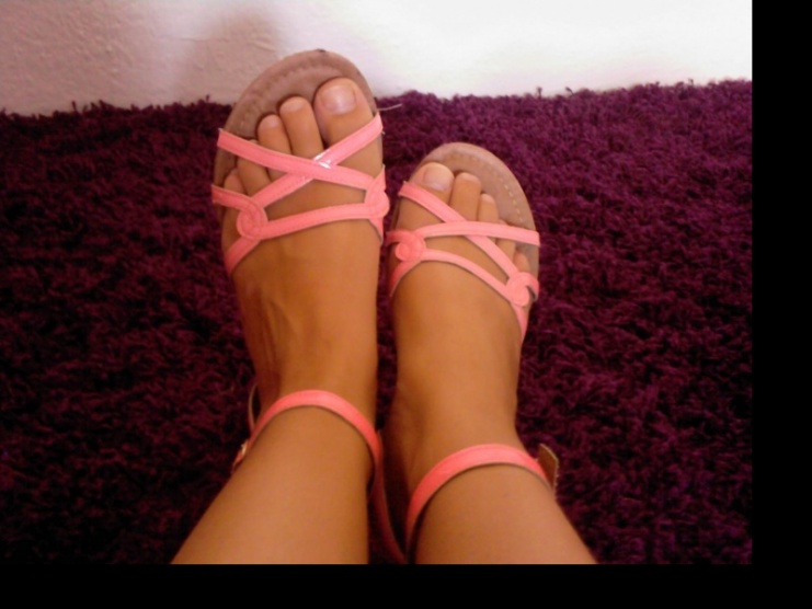 lososové, oranžové / růžové, zářivé, fosforové, svítivé, reflexní sandálky, sandály, mírně lesklé, koženkové, syntetická kůže, páskované, gladiátorky, římanky, značky f&f - tesco, byly trošku ošoupané - zakryla jsem to krémem.