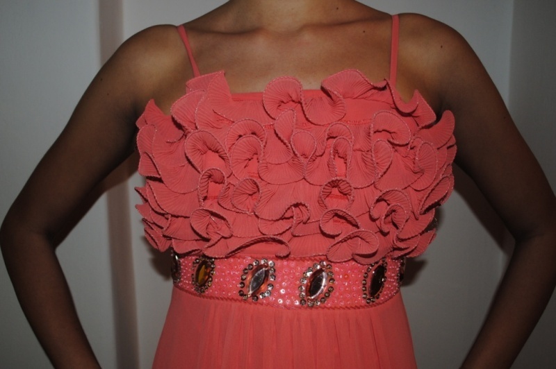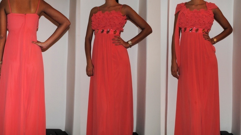 Dlhé krásne spoločenské šaty na výšku cca 165-175 cm v závislosti od podpatku. Merané s výškou 165cm plus podpatok cca 10cm saty sa dotýkajú zeme. Vhodné pre ženy s menším poprsím nakoľko je zváraznený dekolt krásnou dekoráciou. Šaty boli použité raz na spoločenskú udalosť. 100% polyester. Na šaty je možné použiť štolu cez ramená ako na obrázku. V prípade záujmu je možné aj zapožičanie za 500kc