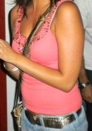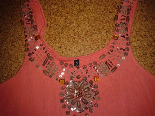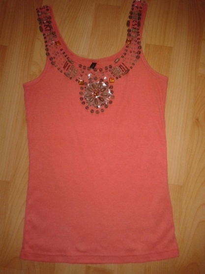 krásný topík lososvé barvy s dřevěnými korálky, vel. S..Délka 58 cm, šířka 2*32 cm, cena vč.pošty