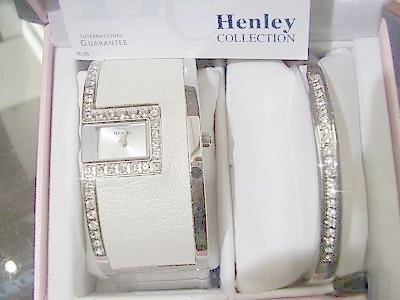 Hodinky jsou z chir. oceli, moderní široký řemínek s perleťově bílou koženkou a nádherně třpytivými krystaly + náramek ve stejném stylu. V reálu vypadají opravdu nádherně. To vše v krásné krabičce.