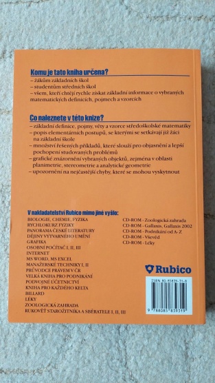 nová, nepoužitá, bez vad, určena žákům základních a studentům středních škol, všem zájemcům, kteří chtějí rychle získat základní informace o vybraných matematických definicích, pojmech a vzorcích, obsahuje základní definice, pojmy, věty a vzorce středoškolské matematiky, popis elementárních postupů, se kterými se setkávají již žáci na ZŠ, řešené příklady, které slouží pro objasnění a lepší pochopení studovaných problémů, grafické znázornění vybraných objektů, zejména v oblasti planimetrie, stereometrie a analytické geometrie, autoři Eva a Miroslav Janurovi, Zásilkovna 79 Kč