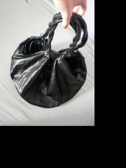 Kabelka má lehce vyztužené dno, uvnitř jednu kapsičku na zip a jednu přihrádku na mobil. Zapínání je šikmé (viz.foto), uši kabelky jsou propleteny. Je nošená zřídka, pouze menší vada: natržený materiál u kovových kroužků (viz.foto).