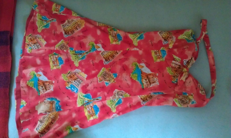 Nádherné meruňkové šaty s obrázky v tématu cestování, všitá výstuž přes prsa, vzadu zip, zavazování za krk, mají podšívku a sukně vytváří půvabný áčkový tvar, který lichotí postavě. Nemačkají se a snadno se udržují. Jsou jen párkrát vzaté, zcela bez vad. Doporučuju na velikost 38. Cena 350 Kč.