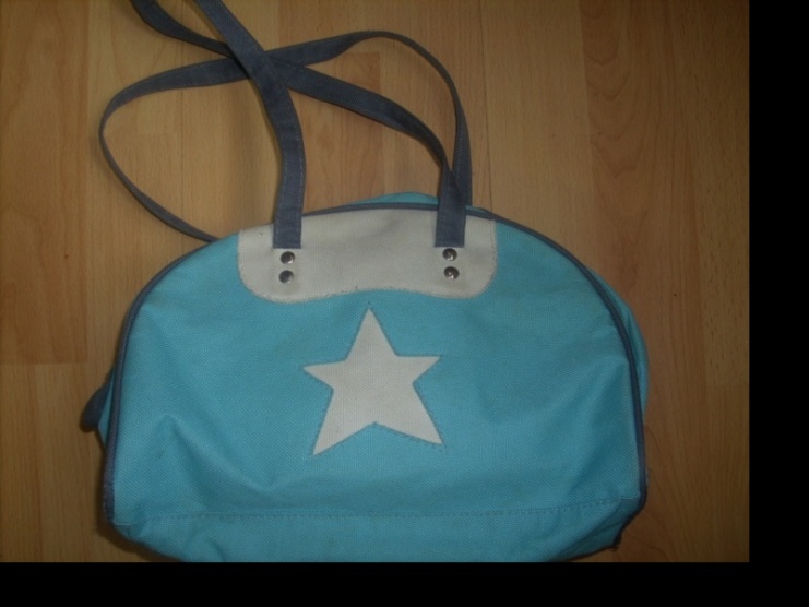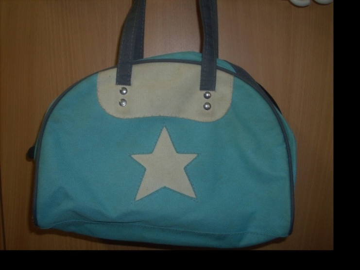 Prodám modro-bílou kabelku s bílou hvězdou. Má tvar oblíbené ''bowlingovky''. Má vnitřní kapsičku na zip.