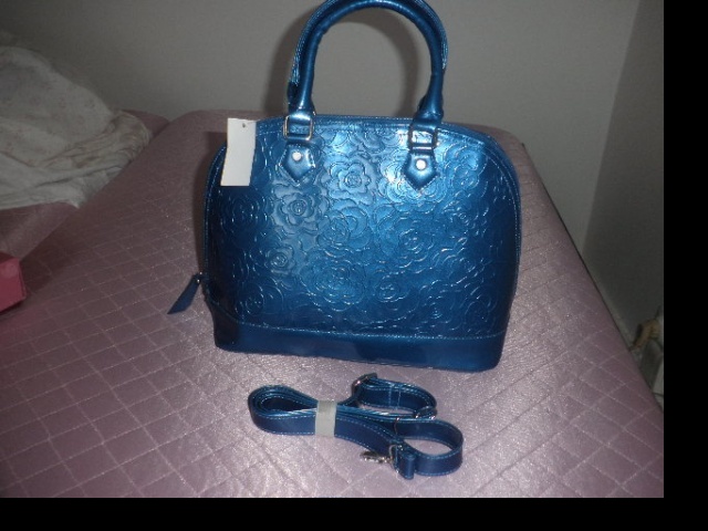 Krásná lakovaná kabelka s lehce perleťovým akcentem, nošení v ruce, odepínatelný popruh, díky kterému ji můžete nosit i přes rameno. Oblíbený tvar.