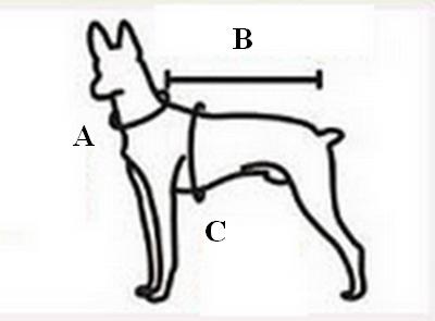 Vhodné pro pejska s obvodem krčku (A) 26 cm, hrudníčku (B ) 37 cm a délkou zádíček (C) 25 cm.