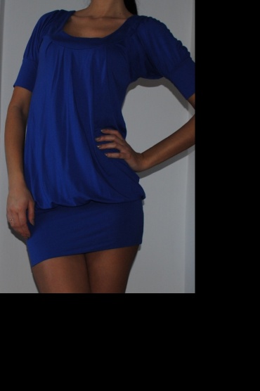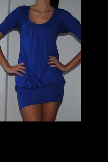 Modré dlhé tričko vhodné ku legínam. Na bokoch široký pás zúžený, oblasť okolo bruška voľné.
