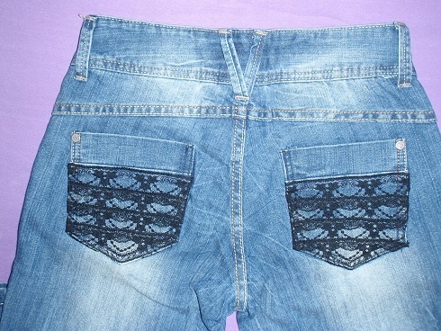 Modré rifle Love. Nové, pouze vyprané. Jsou mi menší. Zadní kapsy zdobené černou krajkou.Pas: 36 cm, délka: 101 cm.