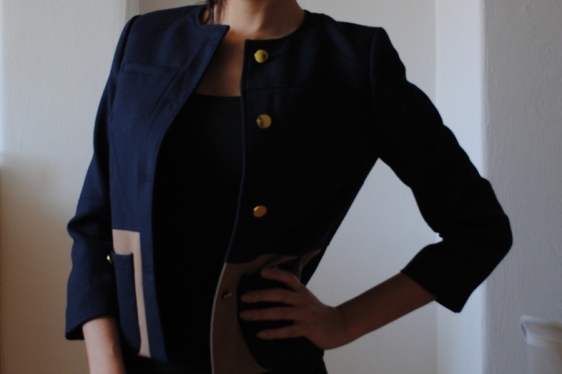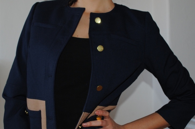 Nikdy nepoužité, modrá kombinácia s hnedou, zlaté gombíky