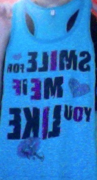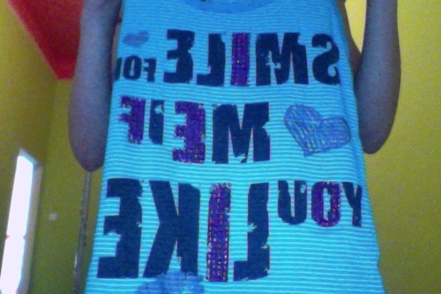 Prodám modré tílko s tenkými bílými proužky a nápisem (smile to me if you like me), ve velmi dobrém stavu, dvakrát nošeno.