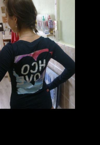 je tm. modré, na zádech má hezký potisk a ve předu velký výstřih