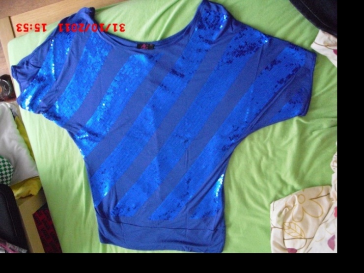Prodám nenošené modré triko s flitry,volnější netopýří střih, je delší - vhodné k legínům i džínům, velikost psaná S, ale řekla bych že je to spíše M, cena 250 i s poštou