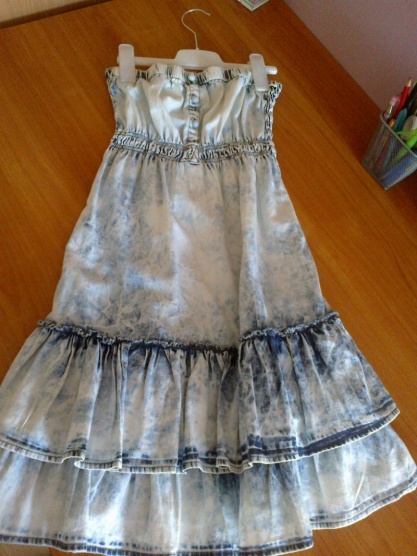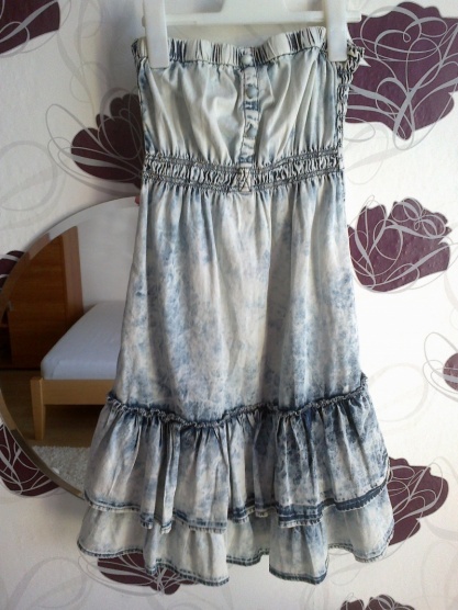 Prodám krásné modrobílé riflové šaty, jsou bez ramínek, sukně volánkovitého typu, vršek s knoflíčkyNeunosím