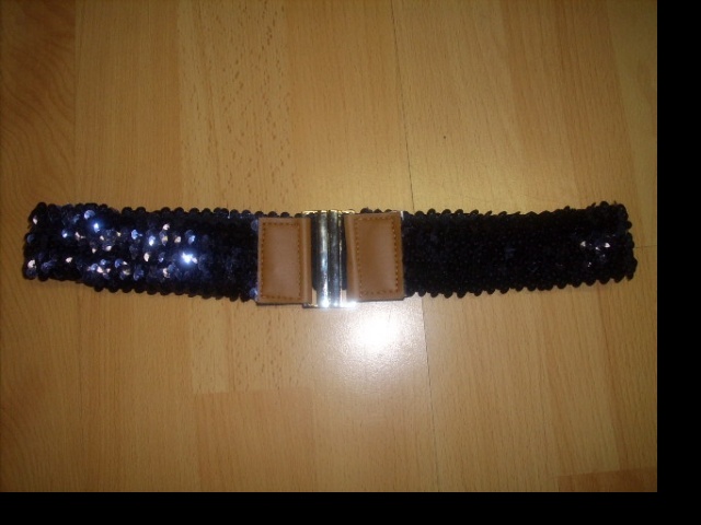 Nový pásek, je na gumu, tmavě modré flitry, hnědá přeska, je moc pěkný. Nevyužiji jej.