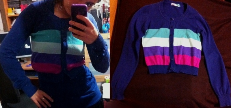 Prodám tenhle pěkný málo nošený svetřík, veselé barvičky, dá se kombinovat jak s růžovou, tak s modrou i fialkovou