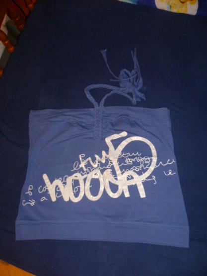 Nenošený modrý top s nápisy. Cena 200 Kč + poštovné.