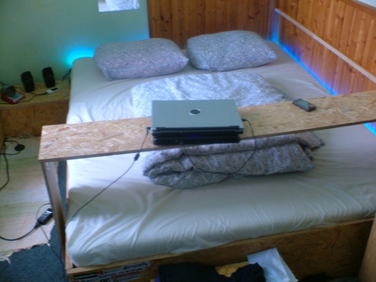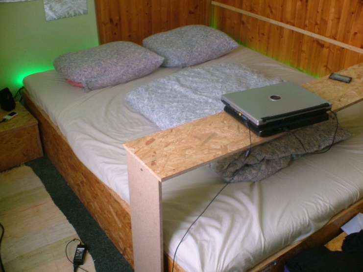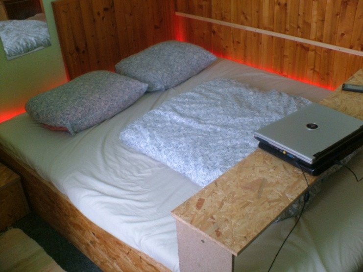 My máme postavenou z OSB desek postel, posuvný stolek nad postel a dva nocni stolky (s mensim uloznym prostorem). V tomhle mesici planujeme jeste postavit skrin s posuvnymi dvermi, taky z OSB desek..