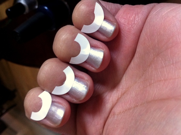 pokud to chceš ale na francouzskou manikúru, tak se obávám, že pod to budou zatékat laky... v tom mi přijde nejlepší izolační páska z OBI, ze které lze ten půl oblouk vystřihnout.