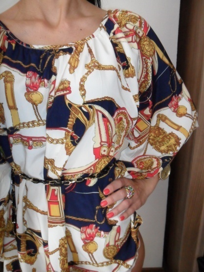 Netopýří rukávy, volnější přizpůsobivý střih. Zlatý pásek kolem pasu.