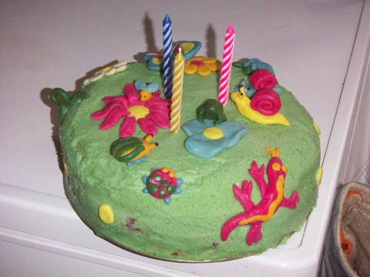 Tak já dělala pro svou tříletou sestru tento na obrázku. Nepotahovala jsem marcipánem, ale prostě obarveným krémem. Dovnitř krém + maliny a zdobila jsem falešným marcipánem