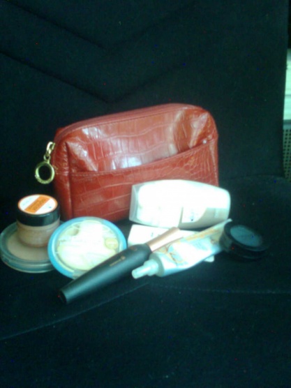 Kosmetickou taštičku nosím s sebou jenom na cesty (i ty kratší půldenní apod.). Je celkem těžká, protože v ní je všechno.. sada štětců, Estée Lauder tvářenka, Guerlain make-up a líčidla, Dior řasenka a na obočí, různé druhy tužek a rtěnek, ořezávátka, pudry (různé druhy) a dalších milion věcí
