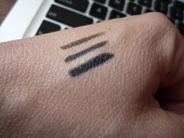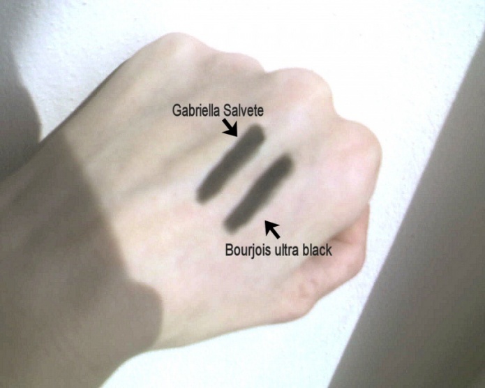 ..co se týká stupně hutnosti barev jak je deklarováno,tak jsou na tom obě tak stejně..nezdá se mi ,že by ta od Bourjois měla víc nebo hutnější pigmenty..jen je ta její černá barva jiného,uhlovatějšího odstínu...