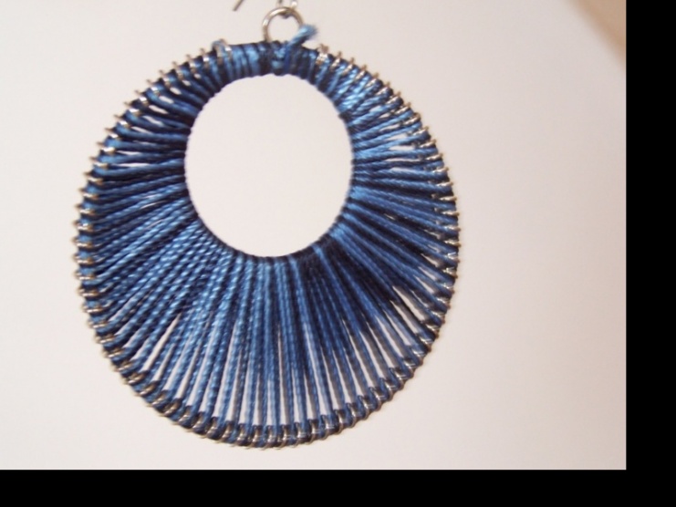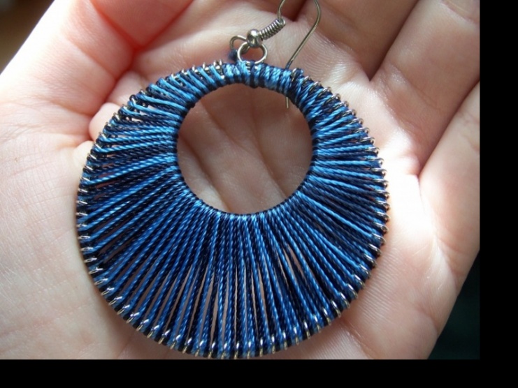 Zajímavé naušnice - kruhy vyplétané dvěma barvami modré nitě.Podobné nosí Hanka Mašlíková.Průměr je asi 4,5 cm.Cena 120,- Kč s poštou.
