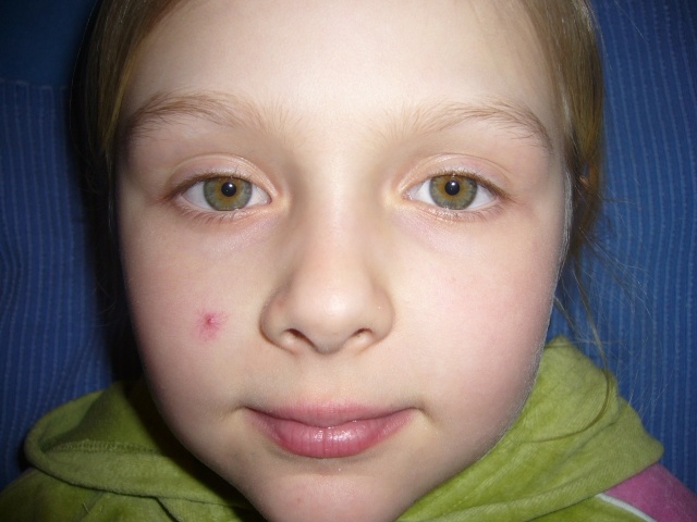 . Potom jsme zasypávaly framykoinem a lepily. Cca po 10 dnech odpadl stroupek a teď to vypadá takto. Jizvička se prý časem zmenší, až nebude vůbec vidět. Což je super. I ta jizvička je lepší než ten šílený rudý flek. Nekteří kluci se jí ve škole smáli, tak jsem ráda, že to takhle dopadlo.