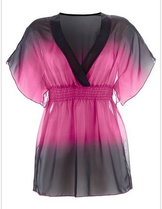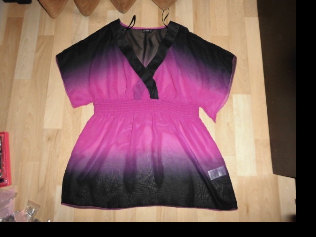 Zcela nová tunika - bez visačky, módní ombré efekt, netopýří rukávy a výstřih do V, podtrhnutá partie pasu díky průvleku na gumu, délka ve vel. 42 cca 76 cm, obvod hrudníku v nenataženému stavu 86 cm a VELMI se NATÁHNE díky gumě (až na 120 cm). lze prát v aut. pračce. 100% polyester.