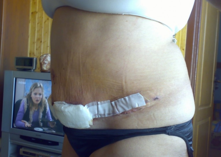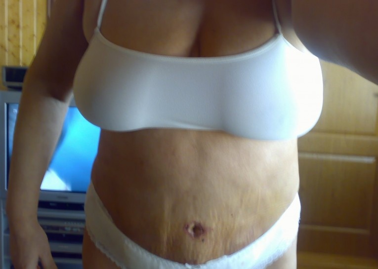 Tak nevím, jestli to je ještě tím, že to mám takové zatvrdé nad tou jizvou, nebo to už tak zůstane? Je to, jako když si dám přes břicho šňůrku a ta jizva to jakoby drží a nad ní se udělá fald. Nejsem silná, takže jsem si myslela, že to bude více rovné.