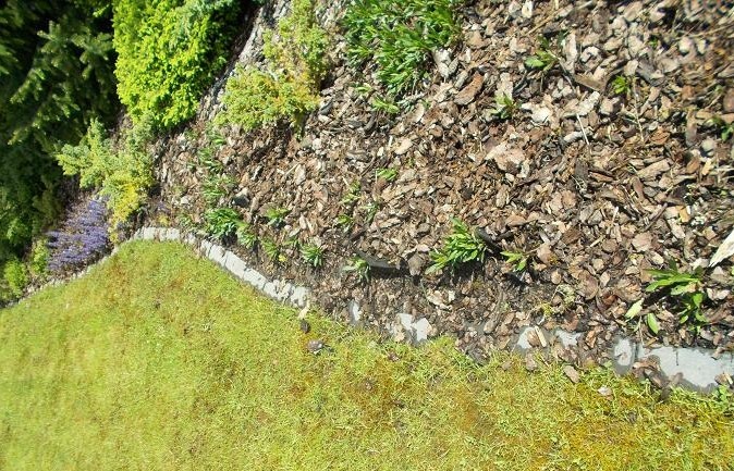 Je velký výběr obrubníků z jakéhokoliv materiálu, já osobně mám 10cm vyhloubené žlábky , které mám zasypané kačírkem .Nikam se to netrousí a nepřekáží při sekání..