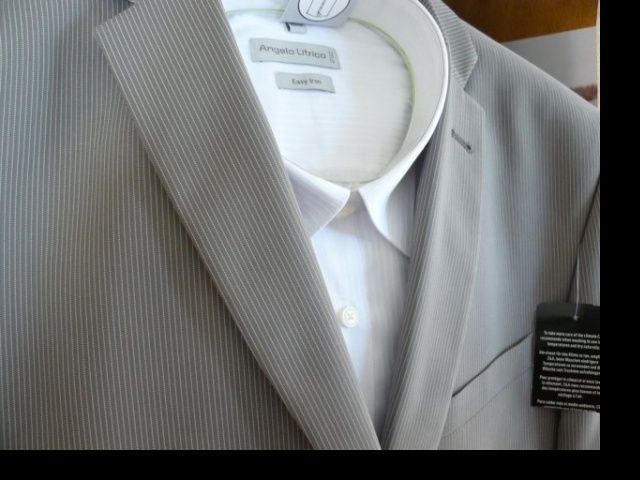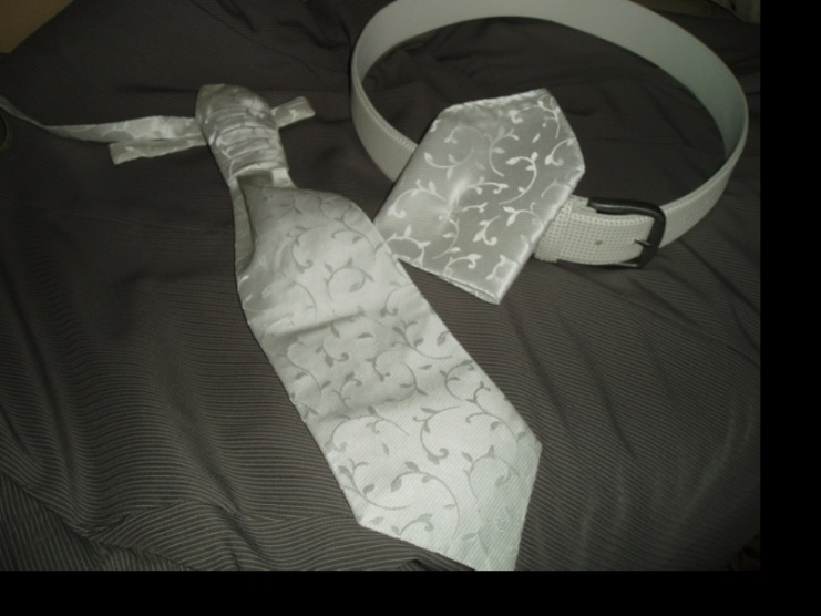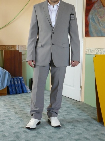 Prodám pánský oblek, jen jednou oblečený, na štítku je velikost 50. Oblek je světle šedý s jemným bílým proužkem. K tomu přidám jednou použitou bílou košili s krátkým rukávem, kravatu s kapesníčkem s jemným lesklým vzorem a bílý pásek do kalhot.