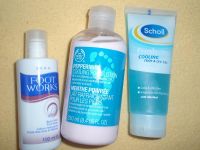 Nabízím nové výrobky: krém od Body shopu-mentolový, gel od Scholl-menotlový a lázeň od Avonu(ovocnou). Cena všech výrobků včetně poštovného je 400kč
