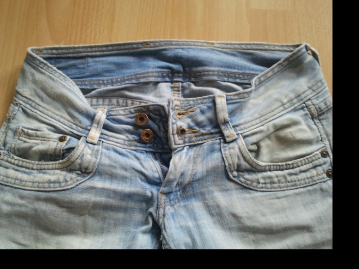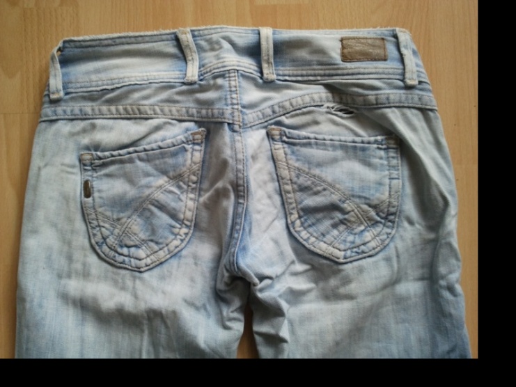 Rifle značky pepe jeans, více nošené, pořizovací cena byla 4500. Veliost: 27/32. Barva: světle modré silnější rifle. Zespod ošoupané od nošení, je potřeba je založit a zašít. Loga značky umístěna na kovových detailech, uvnitř i zvenku.
