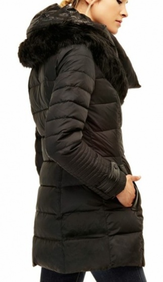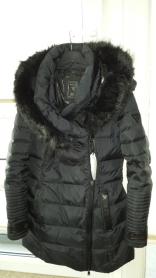 Prodávám krásnou černou péřovou bundu Guess,vel.S,celková délka 70cm,rukáv 60cm.Bunda je nová,včetně visaček,rychle vyprodaná.Kožené detaily na rukávech a kapsách,logo guess na rameni,veliká kapuce s kožešinou,vyteplené kapsy.
