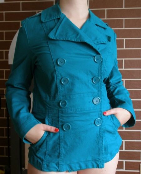 Barvička na fotkách nejde tak perfektně zachytit, je to krásná petrolejová do zelinkava (na fotce spíš modrá). Stáhla jsem jednu z netu a ta by měla odpovídat skutečné barvě kabátku