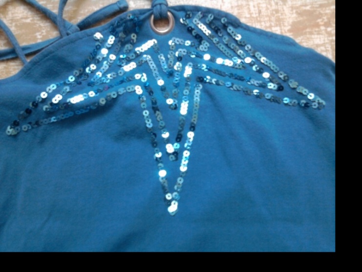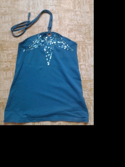 0Nabízím petrolejový top zn. Ann Christine. Top má vázání za krk, zepředu topu flitry v barvě trika poskládané do hvězdy. PC 400, NC: 200 + poštovné