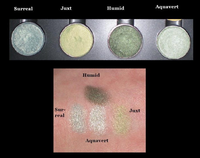ty mac2 - tedy odstíny Surreal, Juxt, Humid a Aquavert nejsou slisované pigmenty, to jsou klasické monostíny, tyto odstíny se v pigmentech nedělají.