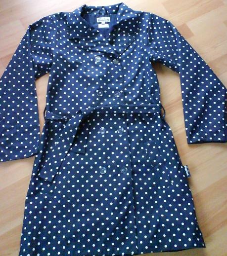 . Takže jedinou pláštěnku, co mám, jsem si koupila v sekáči a je modrá s bílejma puntíkama