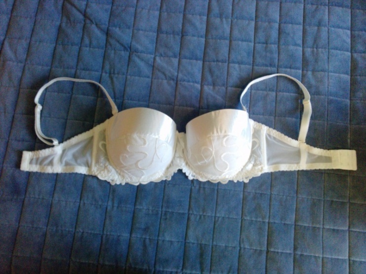 Podprsenka Polly MAT typu bardotka, s jemnou výšivkou, odepínatelná ramínka, v obvodu všitý silikonový pásek, barva "mléčná", vyjmutelné vycpávky. Jednou nošená, vypraná, v originální krabici.