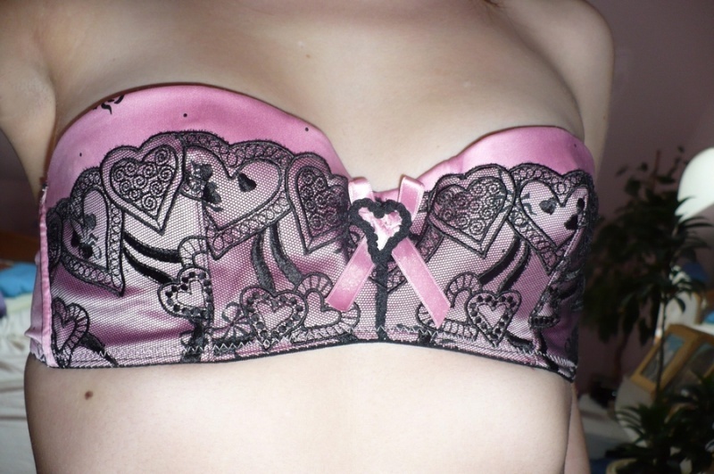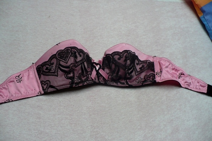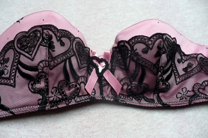 Růžovo-černá barva s černou kraječkou se srdíčky a zdobením, mašlí uprostřed se srdíčkem. Po stranách podprsenky nakreslené mašličky. Je opravdu luxusní.