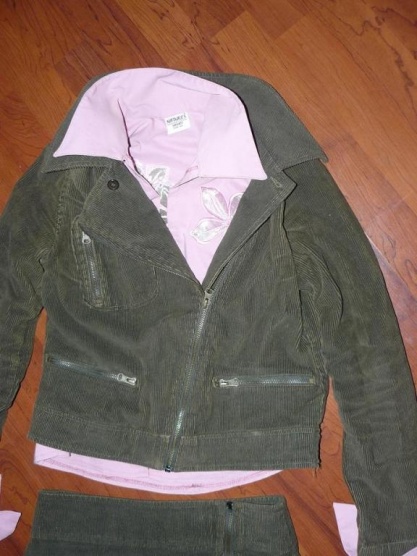 Téměř nenošená souprava sukně i sako asymetrického stylu v barvě tmavé khaky a starorůžová košile s lehce přůhlednými kytkami..