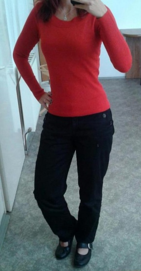 Přikládám fotky, jak jsem oblečená dnes. Kalhoty jsou z HM, ale jsou mi větší, protože jsem zhubla, na jedné fotce pruhované triko, na druhé svetřík. Připadám si, jak kdybych na sobě měla pytel...