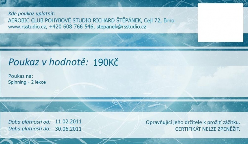 Nabízím poukaz na 2 lekce spinningu v Aerobik club pohybovém studiu Richarda Štěpánka,