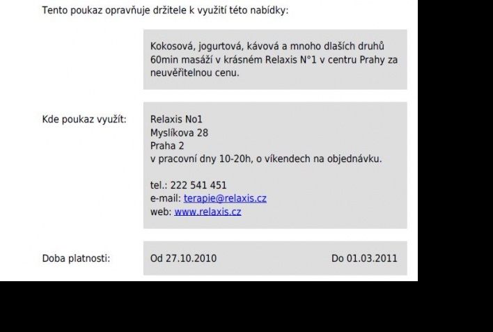 Prodám 2 poukazy (nebo i samostatně, hodnota jedné je 689,-) na masáž dle výběru (květinová, medová, čokoládová, jogurtová, kokosová, kávová, vitamínová, estragonová, vanilková, skořicová, aroma). Je možné jít i společně s partnerem.