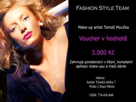 Nechte si poradit od profesionála a užijte si aplikaci skvělého make-upu. Poukaz je zatím na mé jméno - po připsaní peněz na můj účet (osobní setkání v Praze je také možné) nahlásím místo mě Vás a předám Fashion style teamu Vaše kontaktní informace - Vy si poté sami zvolíte termín realizace líčení. Poukaz je platný do Února 2011. Líčení je možné zrealizovat ve studiu (Praha 1) nebo po dohodě u Vás doma - platí zřejmě pouze pro Prahu.